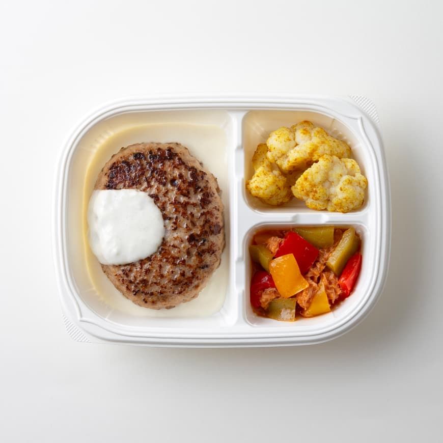 ハンバーグ(鶏肉、豚肉、玉ねぎ、パン粉、牛肉、粒状大豆たん白、その他)(国内製造)、クリームチーズソース、ツナとパプリカのマリネ、カリフラワーカレー炒め/調味料(アミノ酸等)、リン酸塩(Na)、香料、着色料(カラメル、クチナシ、カロテン)、加工でん粉、酸味料