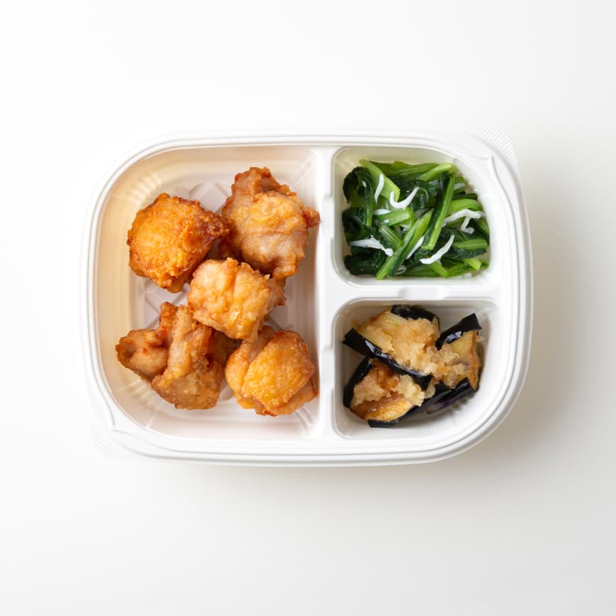 唐揚げ(味付鶏肉(鶏肉、おろしにんにく、その他)、液卵、でん粉)(国内製造)、揚げ茄子のみぞれ煮、小松菜のじゃこ和え/調味料(アミノ酸等)、pH調整剤、酸化防止剤(V.C)