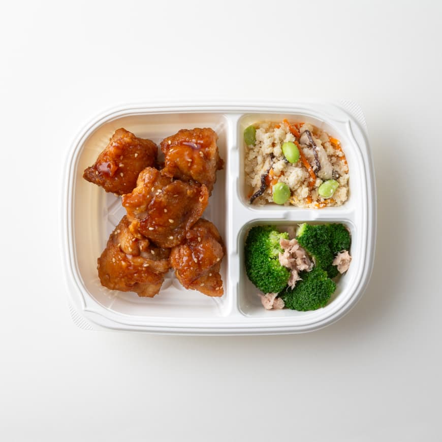 唐揚げ(鶏肉、液卵、でん粉、植物油脂、その他)(国内製造)、おから(おから、人参、枝豆、干し椎茸、その他)、ブロッコリーのツナ和え(ブロッコリー、かつお油漬、その他)、甘辛醤油(醤油、発酵調味料、清酒、砂糖、いりごま)/調味料(アミノ酸等)