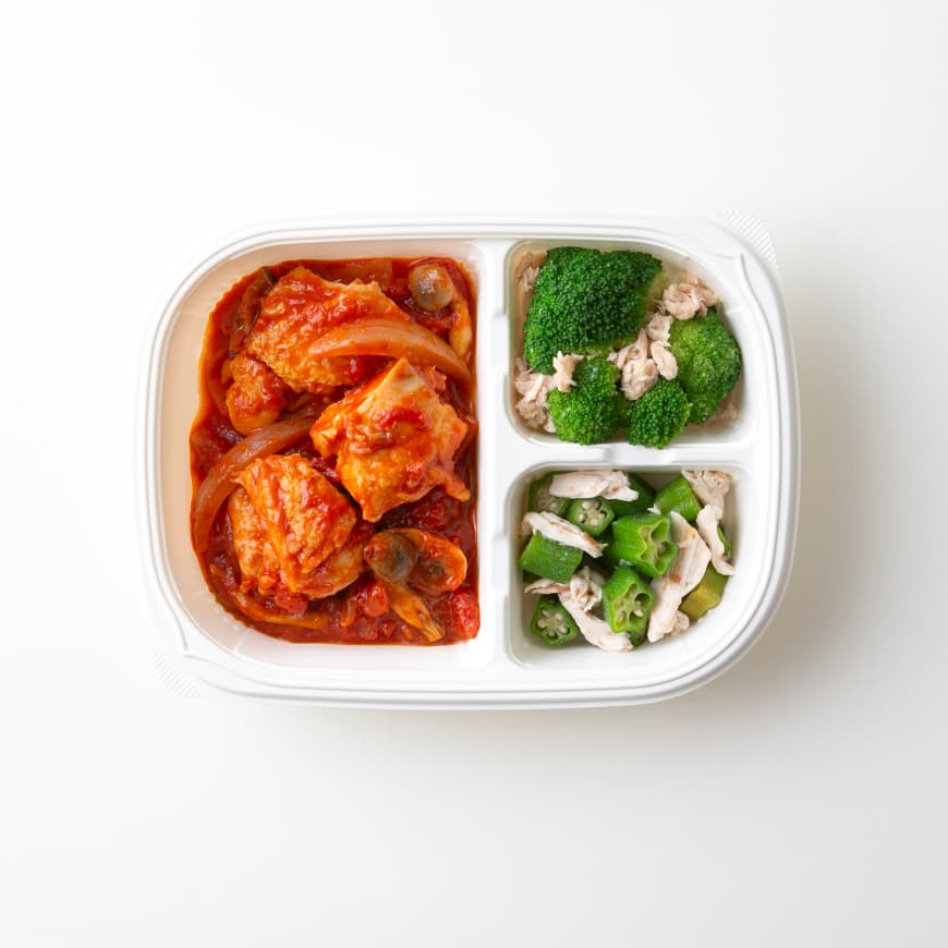 若鶏のトマト煮(鶏肉、ダイストマト、たまねぎ、ワインタイプ醸造調味料、ブナシメジ、マッシュルーム水煮、その他)(国内製造)、オクラ梅ささみ、ブロッコリーのツナ和え/トレハロース、調味料(アミノ酸等)、着色料(カラメル、クチナシ)、香料、増粘剤(カラギーナン)