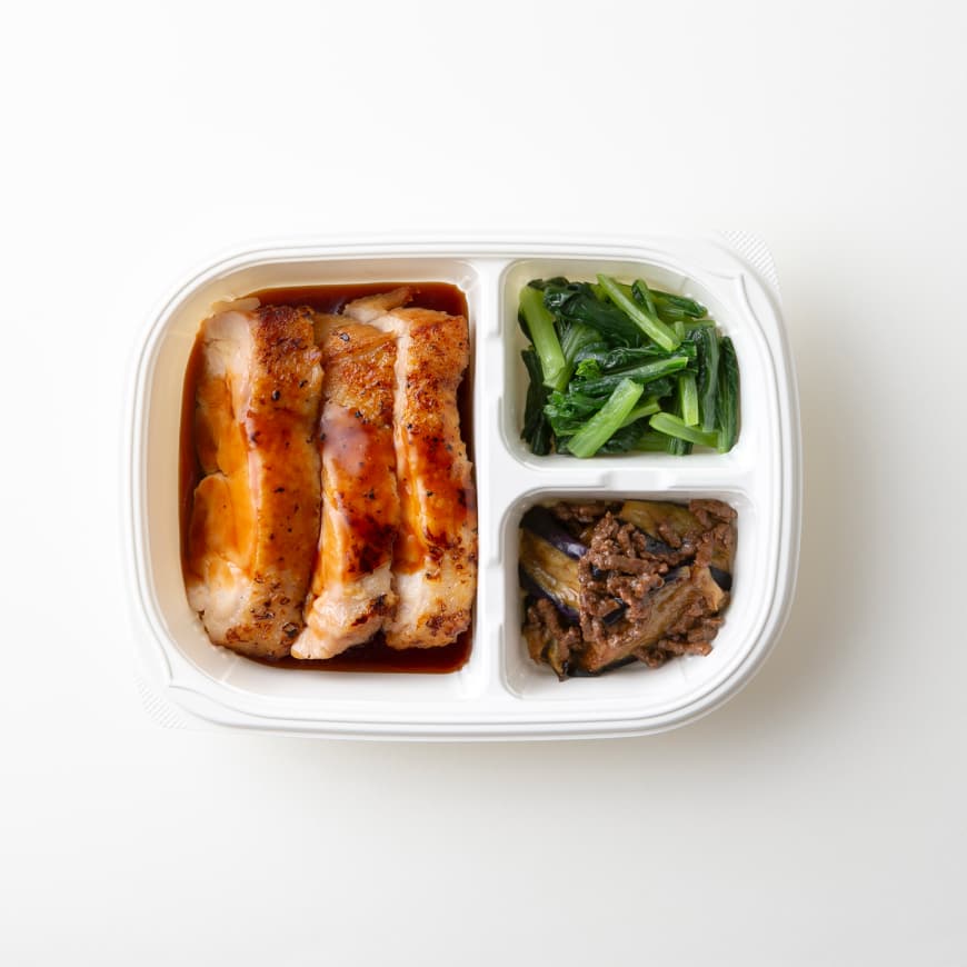 チキンステーキ(鶏肉、食塩)(国内製造)、茄子とひき肉の味噌炒め、テリヤキソース、小松菜ナムル/トレハロース、着色料(カラメル)、調味料(アミノ酸等)、香料