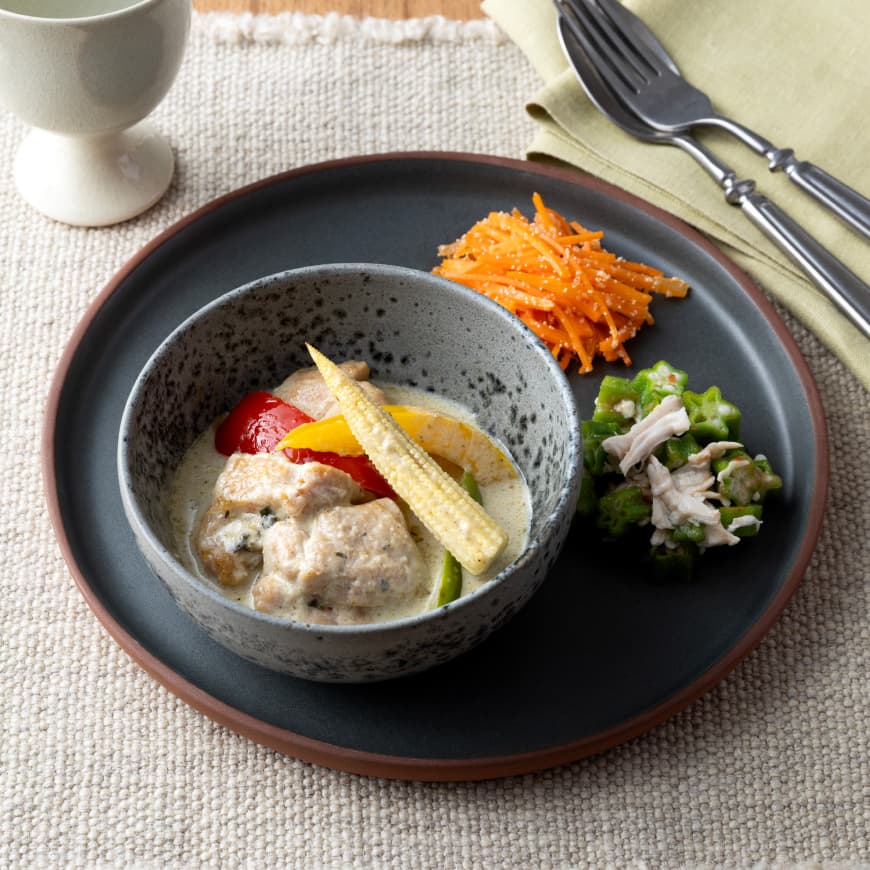 チキングリーンカレー(鶏肉、ココナッツミルク、ミックスピーマン、ヤングコーン、その他)(国内製造)、オクラ梅ささみ、人参たらこ炒め/トレハロース、調味料(アミノ酸等)、香料、着色料(カロチノイド)、増粘剤(カラギーナン)