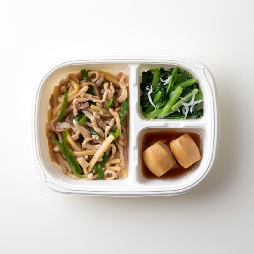 チンジャオロース(豚肉、ピーマン、たけのこ水煮、その他)(国内製造)、里芋の煮物、小松菜のじゃこ和え/加工でん粉、調味料(アミノ酸等)、着色料(カラメル)