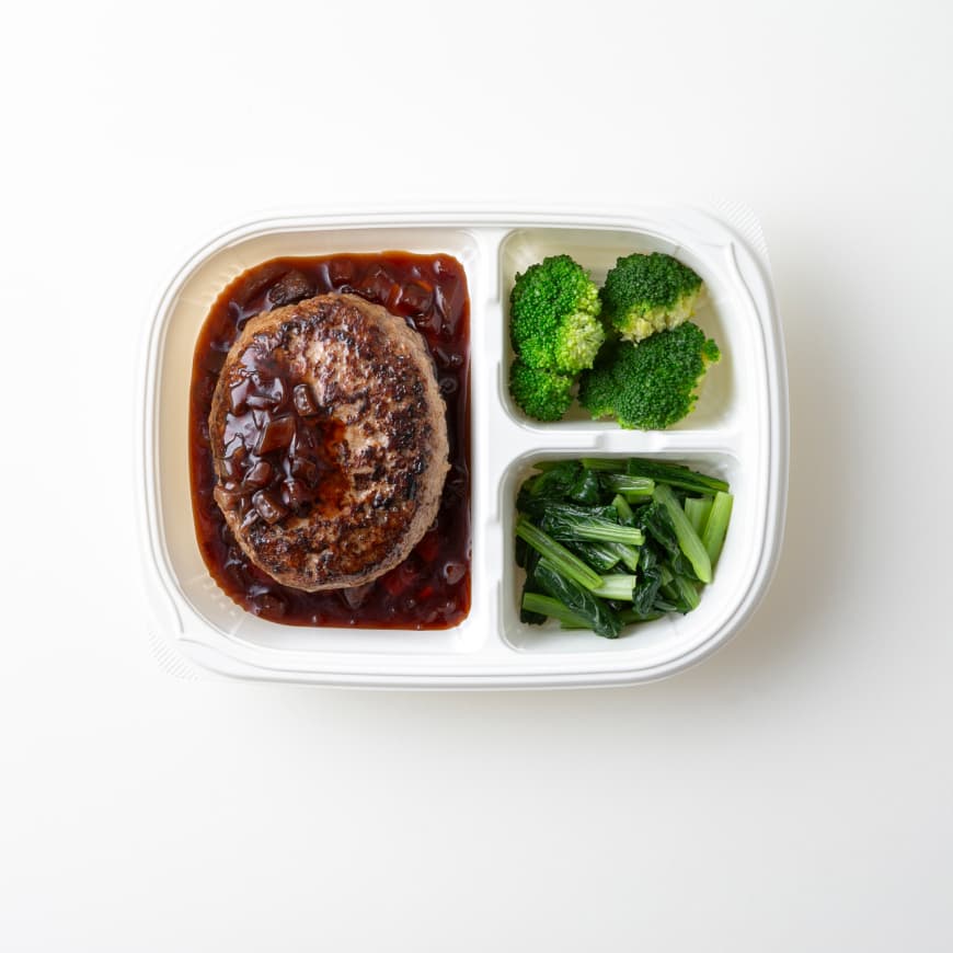 ハンバーグ(食肉(牛肉、豚肉)、玉ねぎ、パン粉、卵白、牛脂、その他)(国内製造)、オニオンソース、ブロッコリー、小松菜ナムル/調味料(アミノ酸等)、着色料(カラメル、クチナシ)、香料、酸味料