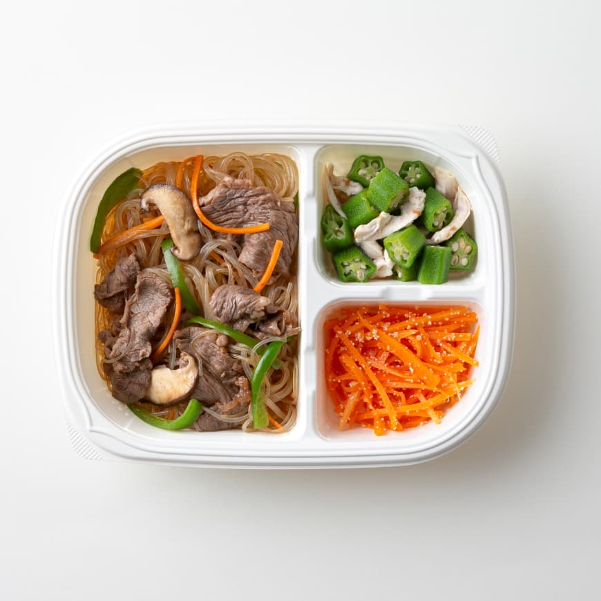 甘辛牛バラ肉のチャプチェ(牛肉、ピーマン、たまねぎ、人参、醤油、その他)(国内製造)、オクラ梅ささみ、人参たらこ炒め/調味料(アミノ酸等)、着色料(カラメル)、増粘剤(カラギーナン)、トレハロース