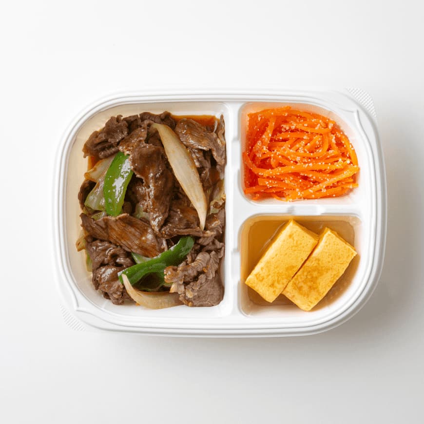 牛バラとキャベツの炒め煮(牛肉、キャベツ、たまねぎ、ピーマン、焼肉のたれ、その他)(国内製造)、厚焼玉子、人参たらこ炒め、和風餡(白だしつゆ、清酒、発酵調味料、その他)/加工でん粉、調味料(アミノ酸等)、着色料(カラメル)