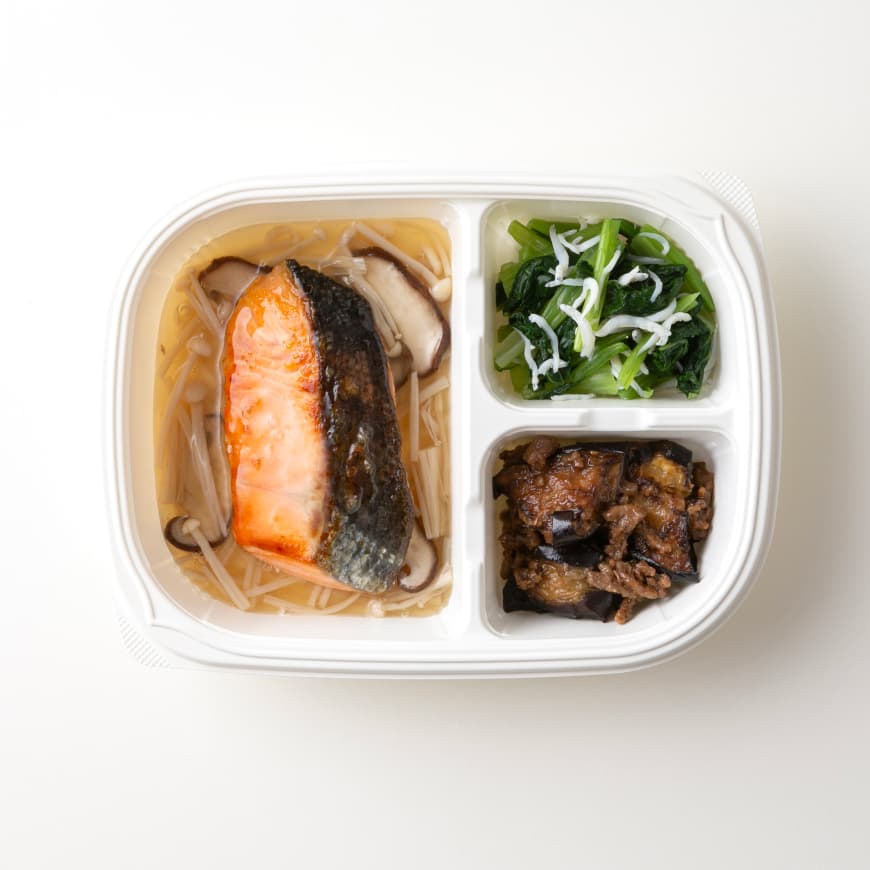 和風餡(えのき水煮、白だしつゆ、その他)(国内製造)、鮭の塩焼き、茄子とひき肉の味噌炒め、小松菜のじゃこ和え/加工でん粉、トレハロース、調味料(アミノ酸等)、漂白剤(次亜硫酸Na)