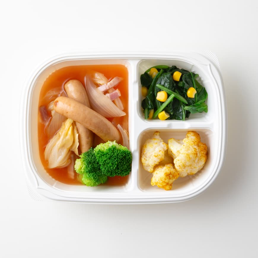 ポトフ(チキンソーセージ、キャベツ、ブロッコリー、ベーコン、たまねぎ、その他)(国内製造)、ほうれん草バターコーン 、カリフラワーカレー炒め/リン酸塩(Na)、調味料(アミノ酸等)、酸化防止剤(V.C)、pH調整剤、着色料(紅麹、カラメル、クチナシ、コチニール、ラック)、グリシン、香料、くん液、香辛料抽出物、発色剤(亜硝酸Na)
