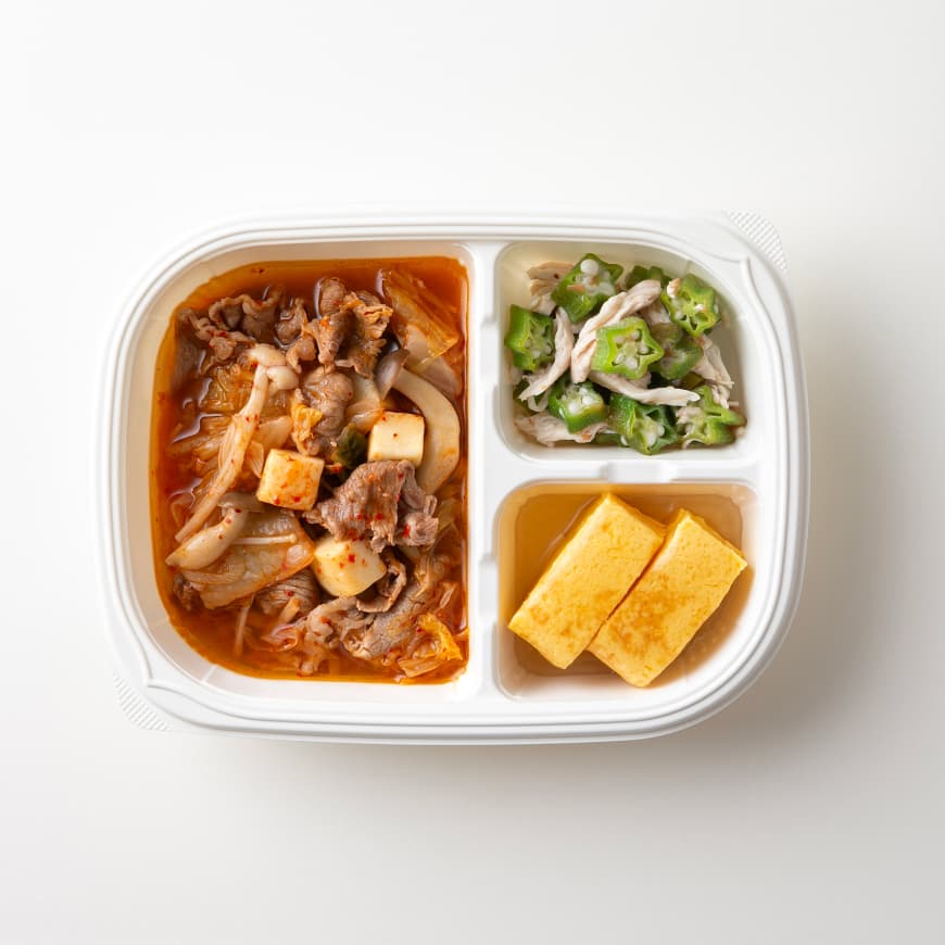 牛バラチゲ(牛肉、キムチ、えのき水煮、豆腐、その他)(国内製造)、厚焼玉子、オクラ梅ささみ、和風餡(白だしつゆ、清酒、発酵調味料、その他)/加工でん粉、糊料(加工でん粉、カラギーナン)、凝固剤、調味料(アミノ酸等)、漂白剤(次亜硫酸Na)、トレハロース