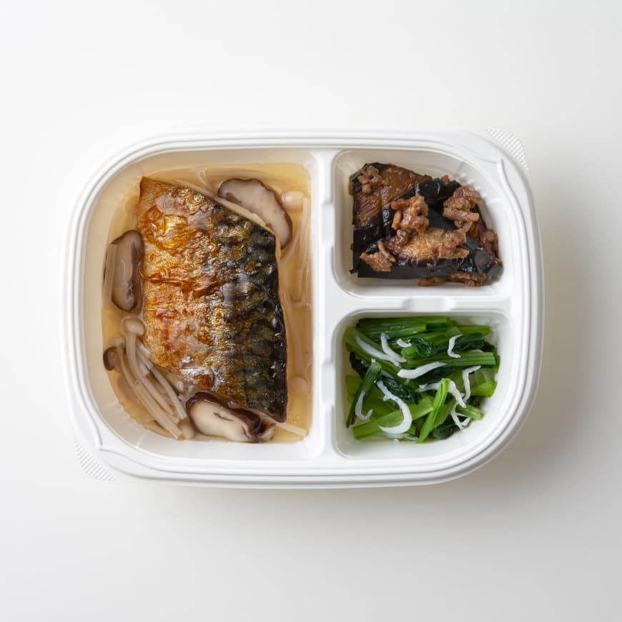 和風餡(えのき水煮、白だしつゆ、その他)(国内製造)、焼き鯖、ナスとひき肉の味噌炒め、小松菜のじゃこ和え/加工でん粉、トレハロース、調味料(核酸等)、漂白剤(次亜硫酸Na)