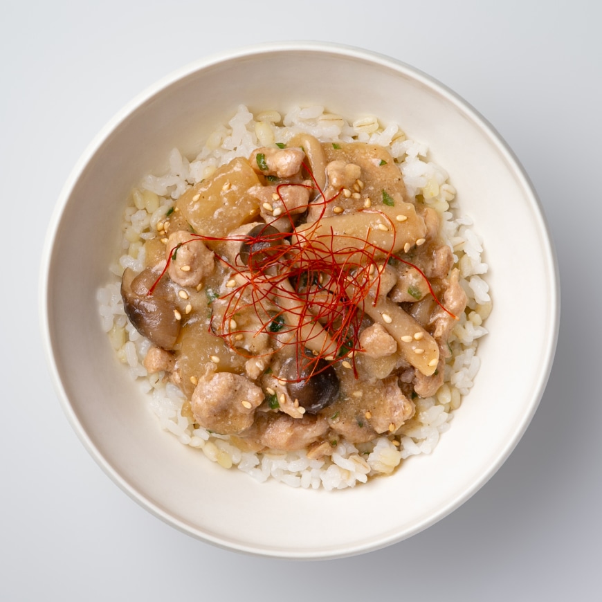 鶏もも肉(ブラジル産、他)、大根、しめじ、本みりん(もち米、米こうじ、醸造アルコール、糖類)、こいくちしょうゆ(食塩、脱脂加工大豆、小麦、醸造酢)、すりごま、バター、食用なたね油、上白糖、あご煮干しだし、かつお削り節、昆布、食塩、大葉/加工でん粉、増粘剤(キサンタンガム)