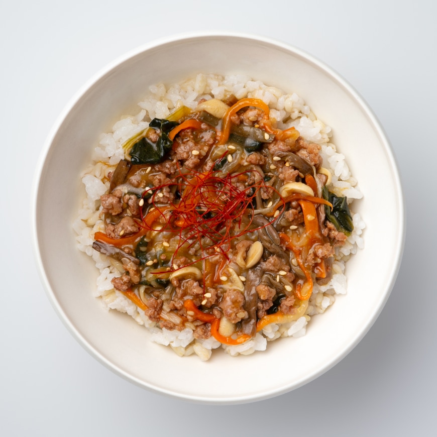 特製タレで炒めたお肉と 彩り豊かなナムルを、甘辛い餡と合わせました。一口ごとに彩りと旨味を楽しめる、華やかな一品。