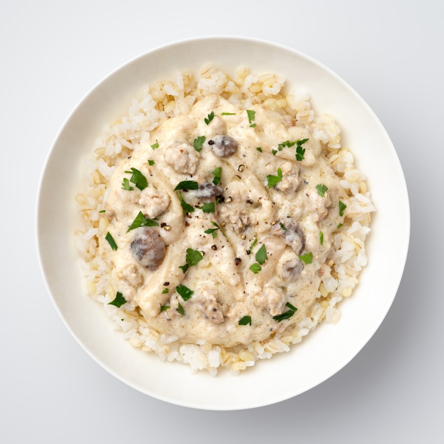 ジューシーなサルシッチャを加えた風味豊かなクリームソースが、ごはんと優しく混ざり合います。ハーブの爽やかな香りとクリーミーな旨味が調和した一品。