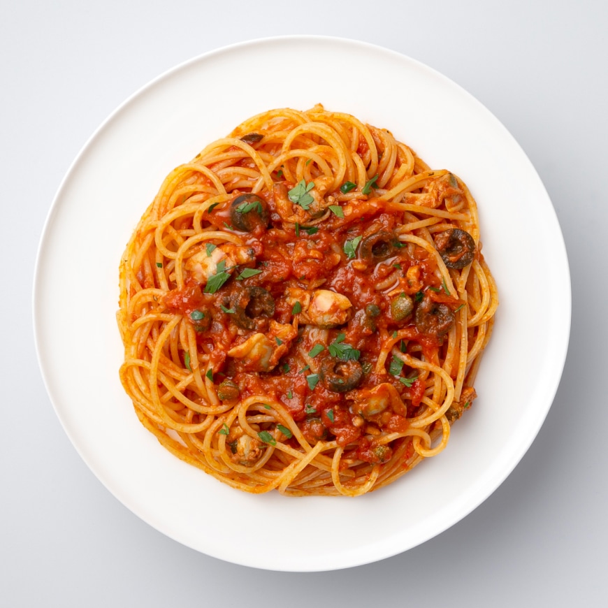 トマトピューレ(イタリア製造)、あさり、オニオンソテー(たまねぎ、大豆油)、白ワイン、植物油脂、オリーブオイル、食塩、オリーブ、ケッパー酢漬け、にんにく、パセリ/クエン酸、グルコン酸第一鉄、調味料(アミノ酸等)